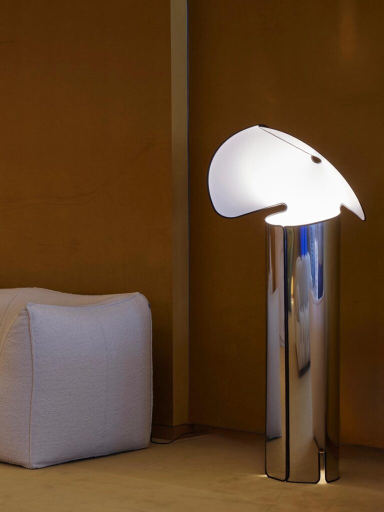 Nel Salone Monumentale, in dialogo con i tendaggi, contribuisce a costruire un’atmosfera raccolta e misurata. Le lampade da terra Arco di Achille Castiglioni e Pier Giacomo Castiglioni, KTribe Floor di Philippe Starck, Captain Flint di Michael Anastassiades e SuperWire di Formafantasma definiscono uno spazio percettivo a scala umana attraverso proporzioni e luminanze calibrate.