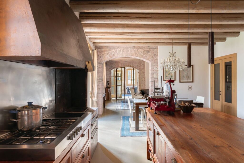 Se l’esterno seduce per la sua armonia con il contesto monumentale, gli interni rivelano un’identità calda e profondamente contemporanea. Tra le pareti de “Il Granaio”, il legno massiccio delle capriate a vista e il mattone vivo dei pilastri costruiscono una scenografia materica che dialoga con elementi di design audaci, in un equilibrio misurato tra memoria e innovazione.